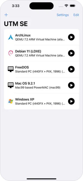 utm虚拟机app基于 QEMU 项目,提供了一个友好的图形用户界面,极大地简化了虚拟机的创建、配置和管理过程。它支持硬件加速虚拟化,在支持的平台上能实现接近原生的性能,同时也能通过 QEMU 的模拟引擎实现全系统模拟,适用于多种场景,如跨平台开发测试、安全研究、教育学习等。