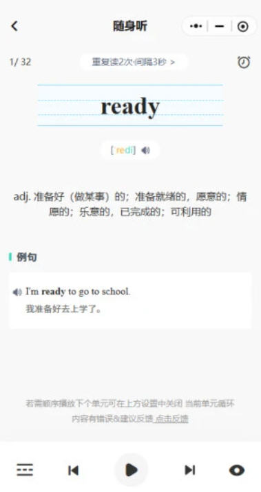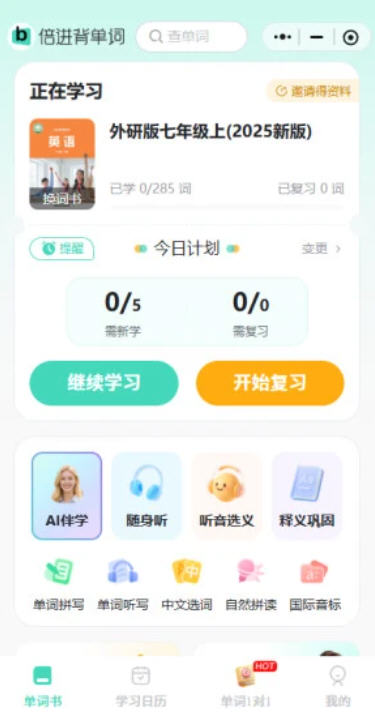 多种学习模式:设置单词闯关、每日打卡等趣味模式,增加学习趣味性。同时提供真人原声与 AI 语音合成双模式,支持美音、英音切换,并提供单词慢读、跟读对比功能。