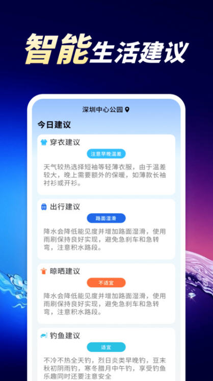 体验贴心:有分钟级降水预报,可预测未来降水时间和强度;提供穿衣、运动、洗车、紫外线等生活指数建议;并根据天气变化自动切换背景。