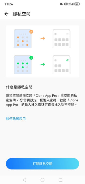 隐私空间设置(可选):若想使用隐私空间功能,可在软件中开启隐私空间,并设置相应密码,之后可将需要隐藏的应用添加到隐私空间。