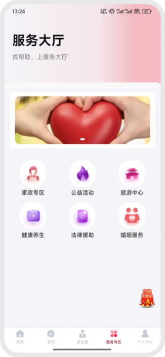 情感服务:心理健康支持、情感咨询以及婚前情感辅导、婚中关系调适、婚后家庭支持等内容。