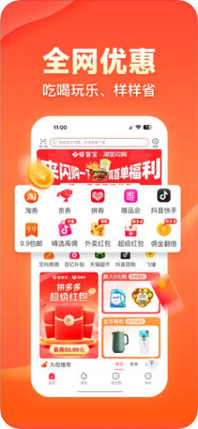 省钱模式:一键领取各平台隐藏优惠券,下单自动抵扣金额,部分商品叠加使用可享受折上折,最高可省 80%。