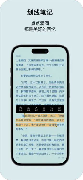 功能实用多样:具备强大的统计系统,可记录阅读时长、进度等数据;支持划线笔记、WiFi 远程管理、自动阅读、听书等功能。