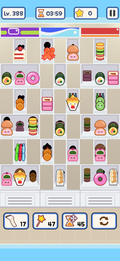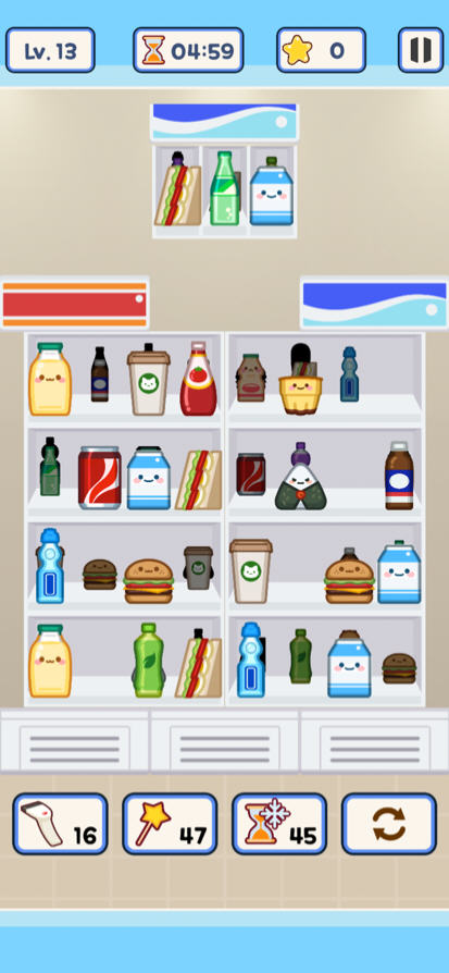 物品分类消除:玩家需要将三个相同的可爱物品放置在同一市场冰箱上,对其进行分类和清除,将物品展示在冰箱背面,继续分类直到所有冰箱都空了。
