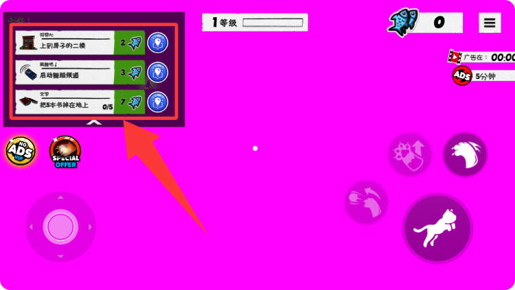 完成任务:左上角会显示任务,如扔出一定数量的书等,完成任务可获得小鱼干奖励,用于提升等级。