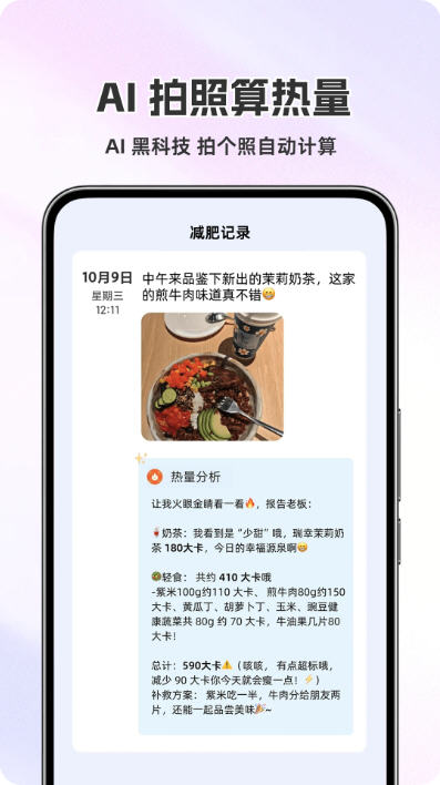 智能拍照识别:操作简便,对准食物拍摄即可自动分析热量与营养构成,识别速度快且准确率高。
