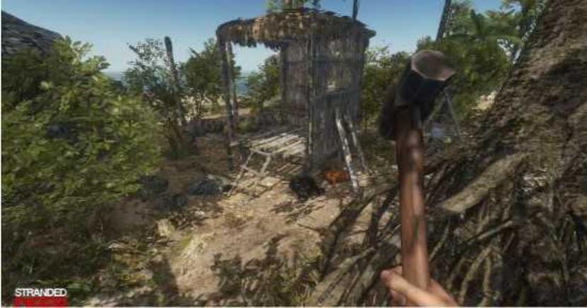 基础资源搜集:开局需收集木材、石头、纤维等基础材料,还可采集椰子补水,狩猎小动物、捕鱼获取食物,保障基础生存。