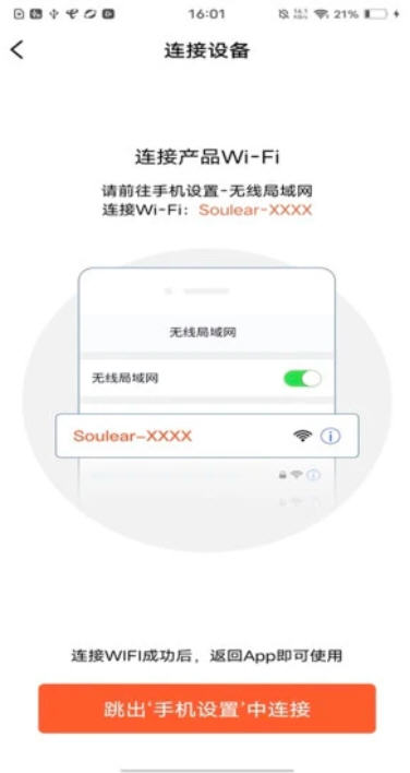 设备连接:长按可视挖耳勺电源键开机,打开 APP 后跳转至手机设置,连接设备专属的 Soulear - xxxxWiFi,返回 APP 点击已连接即可完成配对。