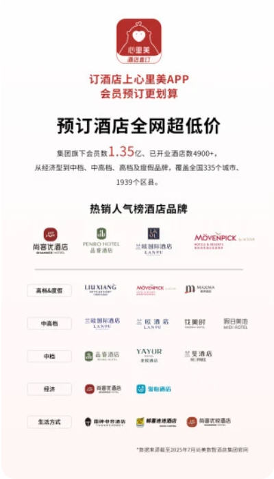 定位是尚美数智酒店集团专属预订平台,旗下涵盖雅高瑞享、兰欧、尚客优、雷神电竞酒店等从高端到经济型的多个品牌。