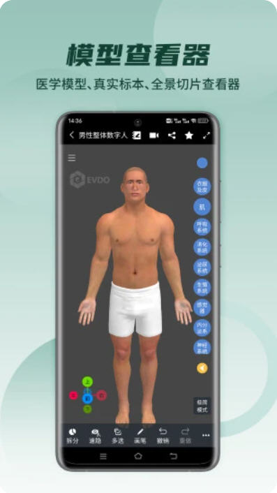 模型操作:打开 APP 进入 3D 数字人界面,360° 旋转、缩放模型,用 “快速解剖” 滑块分层显隐组织,调节透明度查看器官毗邻关系。