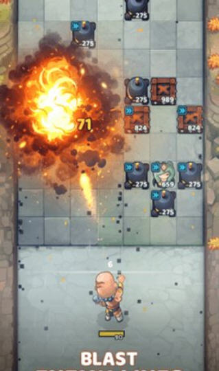 弹射操作:按住屏幕拖动瞄准,调整角度与力度,松手发射弹珠,利用物理反弹击中敌人 / 砖块,触发连锁伤害与消除效果,阻止敌人下落至底部。
