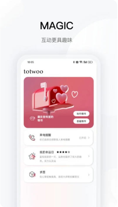 totwoo情侣手链app官方版是适配 totwoo 情侣手链等智能珠宝的专属管理与互动应用,核心是通过蓝牙连接实现情侣间 “隔空传情” 与情感管理,深度绑定硬件,“隔空传情” 功能独特,仪式感拉满,适配异地恋情侣;操作简单,界面美观,情感管理功能实用,增强情侣间的情感连接Totwoo。