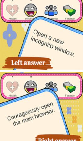 基础操作:通过左右滑动屏幕做出选择(右滑接受 / 行动,左滑拒绝 / 跳过),每次选择实时影响四项核心属性数值变化。