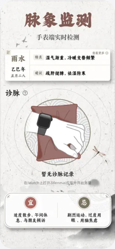 把脉maiwatch官网版app是一款融合中医理论与 AI 技术的智能健康监测 App,适配 iOS、Apple Watch,支持手机端指尖测脉与手表端传感器采集,核心定位为 “脉象检测 + 体质分析 + 养生建议”,面向中医养生爱好者与健康管理人群。通过 AI 算法解析脉搏数据,结合二十八脉象与中医体质理论,生成个性化养生方案,提供面诊、舌诊、宜忌相机等扩展功能,基础功能免费,部分深度分析、专属方案需付费订阅,数据仅本地 / HealthKit 存储,不替代专业医疗诊断,仅作日常健康参考。