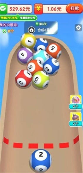 奖励获取:完成关卡挑战、达成特定成就或合成高阶数字,可获得红包奖励与金币,红包可按兑换比例提现,金币可用于解锁小球皮肤、购买道具。