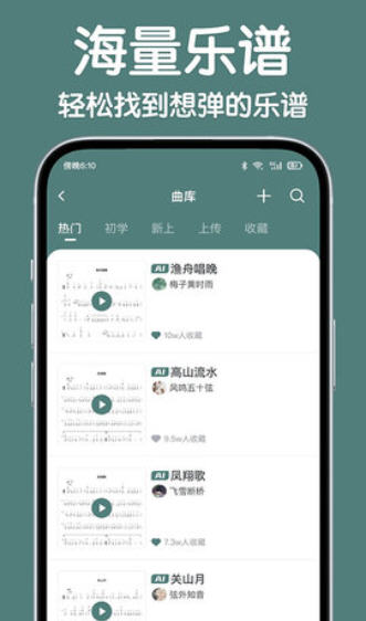 曲谱查阅:在曲谱库搜索或筛选曲目,高清简谱支持自动翻页、AB 段循环,方便对照练习。