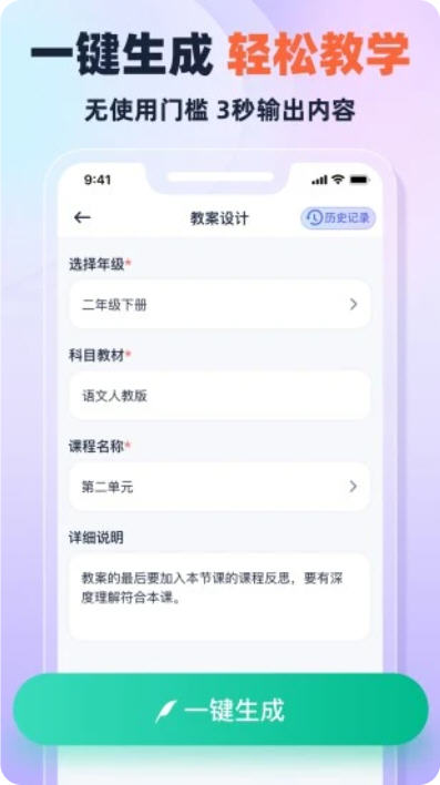 选择学段与学科,输入教学主题,一键生成完整教案、公开课逐字稿。