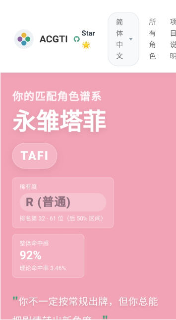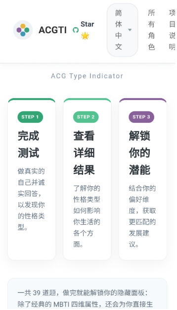 ACGTI二次元人格测试app最新版本是专为二次元爱好者量身打造的MBTI 趣味人格测评神器,基于经典 MBTI 四维人格模型,结合 ACG 圈层专属情境题目,把枯燥的性格测试变成二次元角色匹配体验。完成测试即可解锁专属二次元人设、精美立绘与完整性格解析,免费无广告、无需登录,是漫友自我探索、趣味玩梗、社交配图的宝藏工具。
