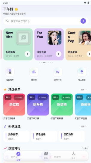 下载安装后打开,无需注册即可进入主页,首页直接推送热门新歌、经典老歌及精选歌单。