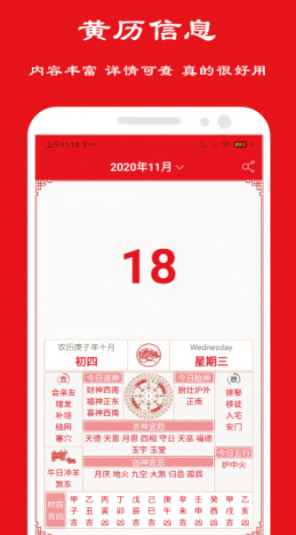 3.传统的黄历,属相冲向,宜忌趋势,财神方位、时辰凶吉、电子罗盘一览无遗,应有尽有。