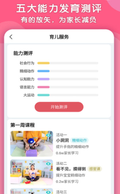 拥有着五大能力发育的测评,能够帮助到家长减轻不小的压力,直接在手机上面就可以进行测评使用了,如果学习的过程中遇到困难,那么是可以向老师请教,老师也会及时的为您解答,帮助到孩子更好地进行早教服务,得到快乐的成长哦,有需要的朋友是可以来到这里进行使用的。