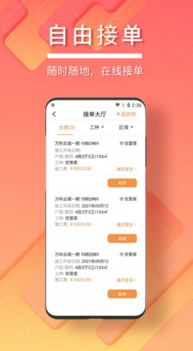 1、专为装修行业从业人员打造的在线接单平台,自由接单,灵活便捷,发现更多装修订单,获取更多赚钱机会,在线结算,交易放心;
