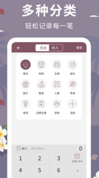 2、分类记录:用户可以根据消费的类型进行分类记录,例如工作、美食、购物等等不同的类型进行统计,你可以根据统计结果来查看消费占比;