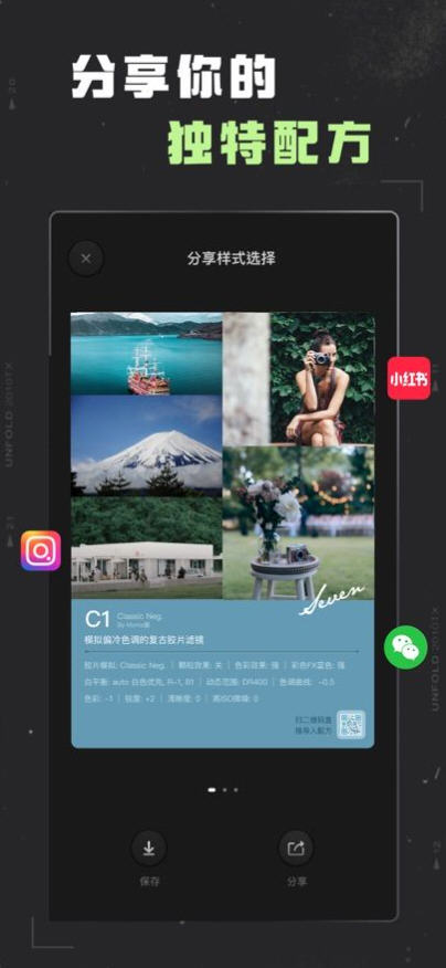 您还可以使用“公式相机”创建自己独特的颜色公式并分享,或者轻松导入他人的公式以丰富您的创作灵感。