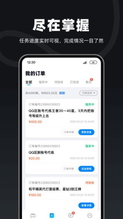 3.订单大厅汇集了各种订单,按游戏区划分,操作方便,可以随时随地接受订单,拓展业务。